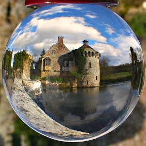 The crystal ball is in effect a lens, when an object is viewed through the ball it will be reversed and you will see the image upside down, to get the desired effect you need to place the ball a reasonable distance away from the object being photographed. The distance between the subject matter and the crystal ball will be dictated by the size and scale of the object to be photographed, so quite often a bit of experimenting with distance is required. You can often find a suitable wall, fence, rock or similar to set the ball on, or you could us a camera tripod with a small platform fitted instead of a camera, that gives you more flexibility when placing the ball. If your location for the ball is not flat enough to accommodate the stand you could use a bean bag or similar to support the ball, often you can dispense with the stand for the ball, if for instance the top of a wall has a nice coating of moss placing the ball on the moss can enhance the final image.